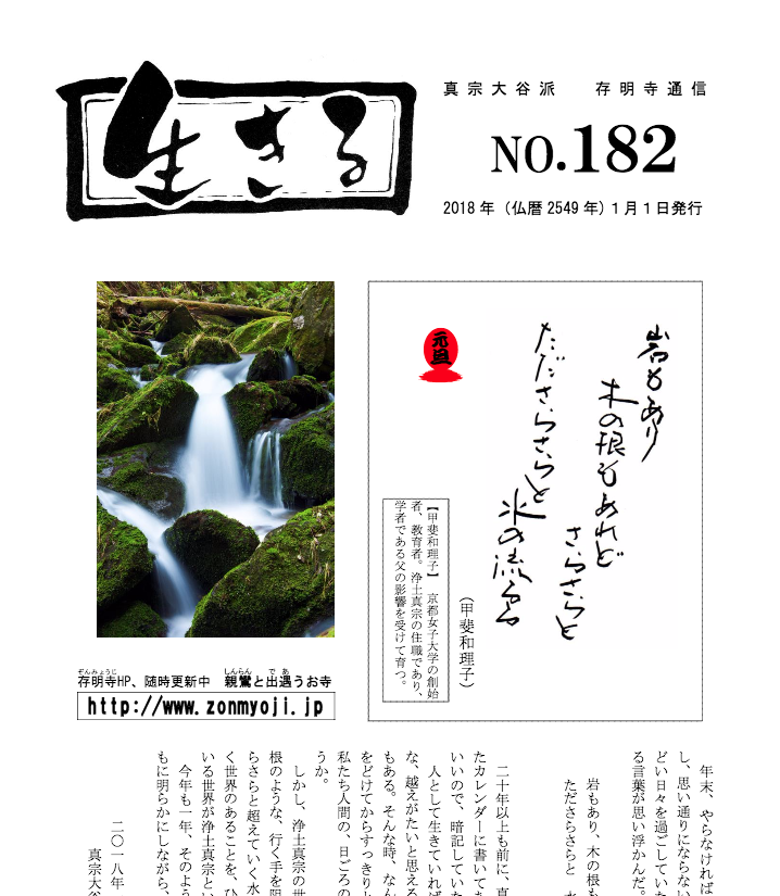 真宗大谷派 存明寺通信『生きる』 182 号です。 発行日 2018 年(仏暦2549年)1月1日 ≪目次≫ 表紙⇒ことば・巻頭言・写真 2頁⇒児童教化のページ(上) 4頁⇒児童教化のページ(下) 6頁⇒お寺のひろば(行 […]