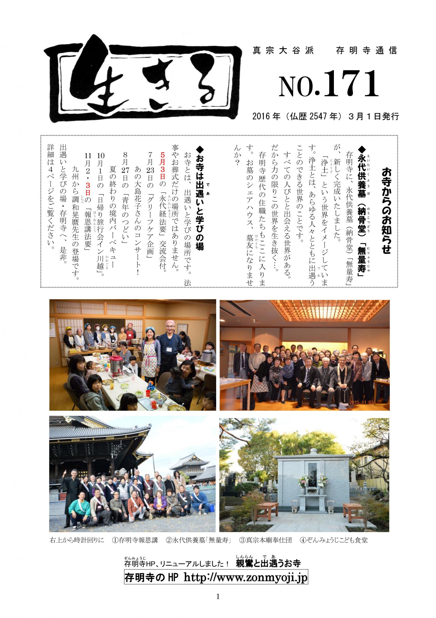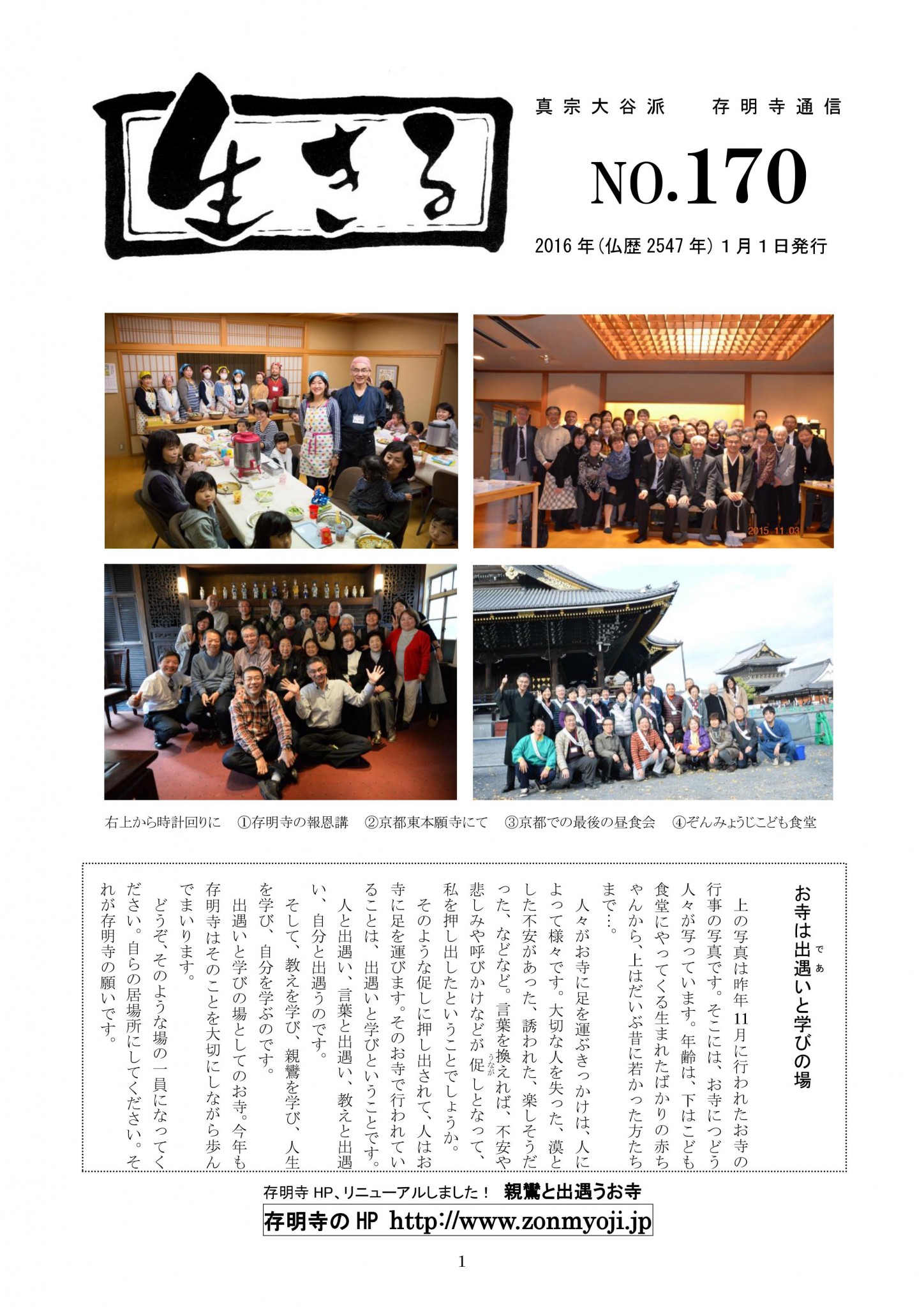 真宗大谷派 存明寺通信『生きる』 170号です。 発行日 2016年(仏歴2547年)1月1日 ≪目次≫ 表紙⇒写真4点 お寺は出遇いと学びの場 2頁⇒住職のコラム「そういう私はどこへいくんだろう」 3頁⇒お寺の活動「 […]